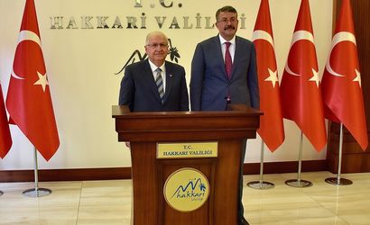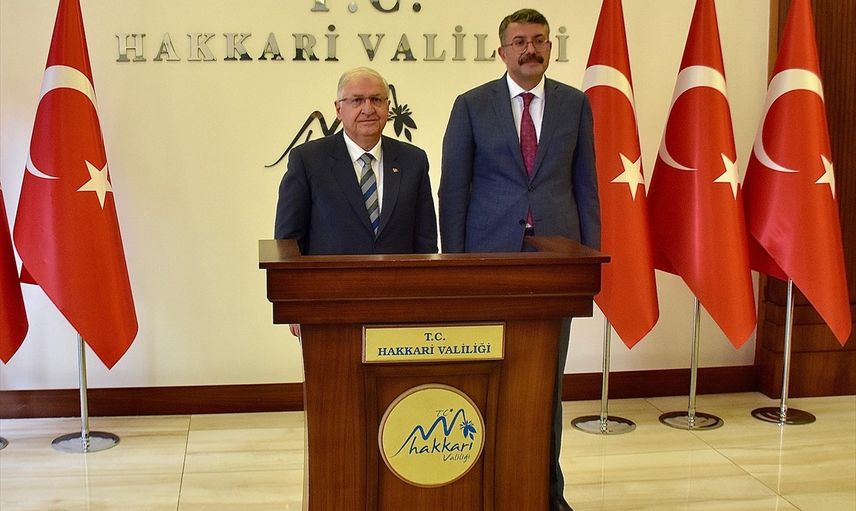 Milli Savunma Bakanı Yaşar Güler (solda), Hakkari'deki programı kapsamında Hakkari Valiliğini ziyaret etti. Bakan Güler, Vali Ali Çelik (sağda) ile görüştü.
