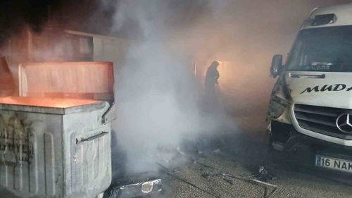 Mudanya Yumurtatepe'de gece yarısı minibüs duraklarında yangın: 20 minibüs son anda kurtarıldı