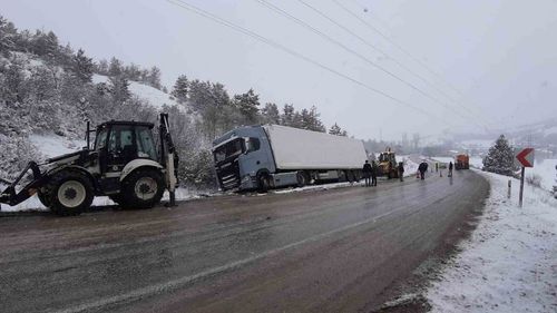 Mudurnu-Nallıhan yolunda kayan tır şarampole devrildi; iki kepçe ile kurtarıldı