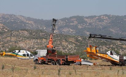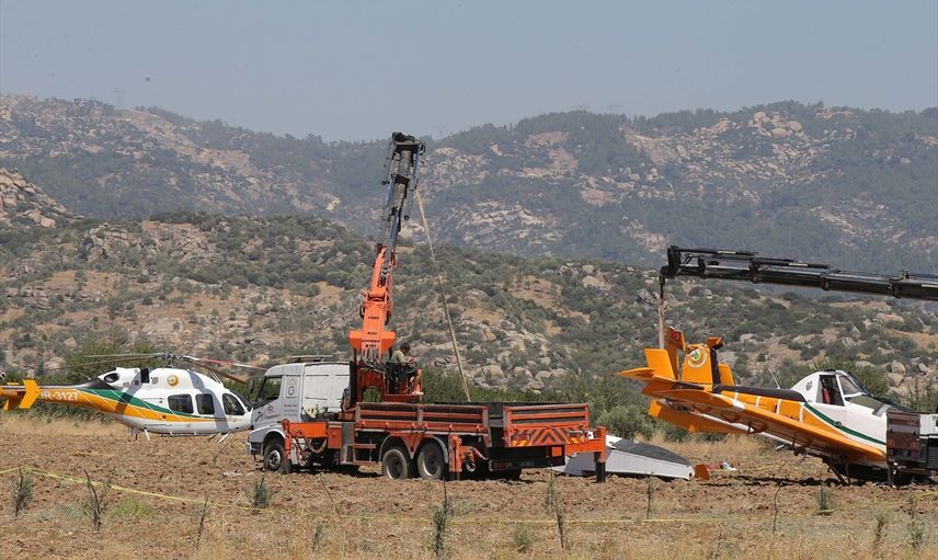 Aydın'daki orman yangınına müdahale için kalkan ve dün Muğla'nın Yatağan ilçesindeki Hacıbayramlar Mahallesi'ne zorunlu iniş yapan uçağın enkazının kaldırılması için Ankara'dan kaza kırım ekibi geldi. Ekip uçak üzerinde inceleme yaparken, ters dönen uçak, vinç yardımıyla düzeltildi. Kaza nedeniyle uçaktan ayrılan su tankları ve bazı parçaları, vinç yardımıyla kamyona yüklendi.