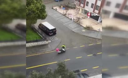 Kayıtlara yansıyan görüntülere göre, tıkanan mazgal su birikintisine yol açtı. Duyarlı motokurye yol kenarında durup mazgaldaki çöpleri ayağıyla temizledi ve daha sonra siparişini teslim etmek üzere yoluna devam etti.
