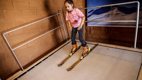Mersin'de mühendis Gökalp Bulut, kızı için tasarladığı kayak simülasyonuyla salon ortamında kayak eğitimi veriyor.
