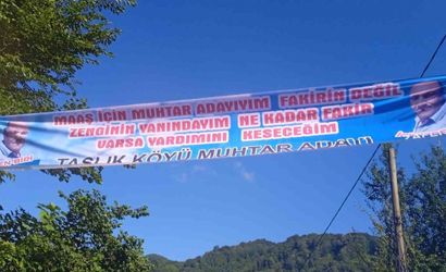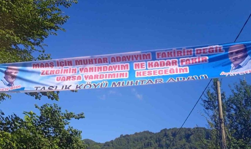 Türkiye 31 Mart 2024’te yerel seçimler için sandık başına gidecek. Bazı mahallelerde muhtar adayları, seçim çalışmalarına erkenden başladı. Bunlardan biride Taşlık Köyü muhtar adayı Zafer Fison oldu. Giresun’un Görele ilçesine bağlı Taşlık Köyü’nde muhtarlığa adaylığını koyan Zafer Fison ise hazırladığı pankartla sosyal medyayı salladı. Fison’un köye astığı pankartta, “Maaş için muhtar adayıyım. Fakirin değil, zenginin yanındayım.” ifadeleri yer aldı. Ancak Fison bu pankartı asmak için izin almadı. Harekete geçen jandarma ekipleri, köye gelip pankartı yerinde inceledi. Ardından tutanak tutularak, Fison’a “izinsiz afiş asma” suçundan bin 295 lira para cezası kesildi.
