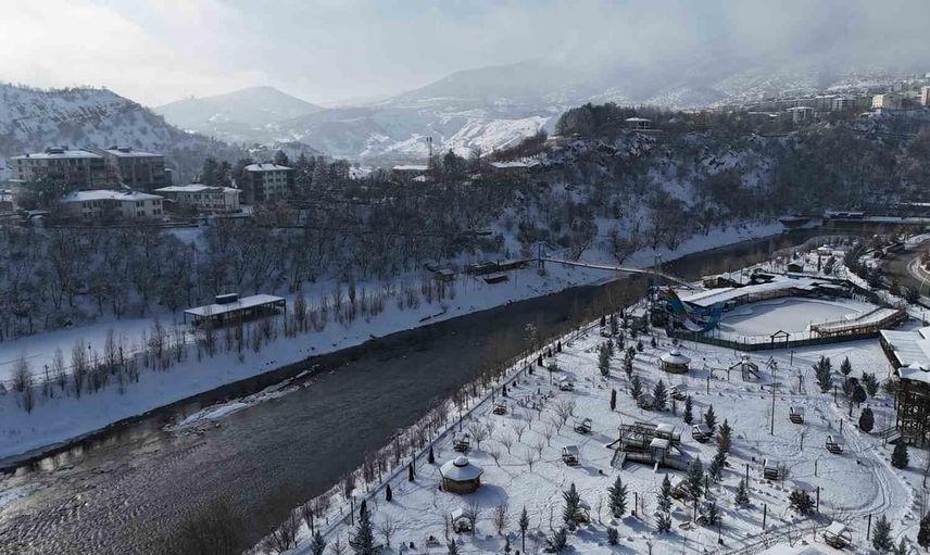 Munzur Dağları eteklerinden süzülerek kent merkezinin kıyısından geçen Munzur Nehri, karla kaplı vadinin içinde kontrast oluşturan bir görünüm sergiledi. Dağlar, vadiler ve yerleşim alanları kalın bir kar tabakasıyla kaplanırken, ortaya çıkan manzara kentin kış mevsimindeki doğal dokusunu ön plana çıkardı.