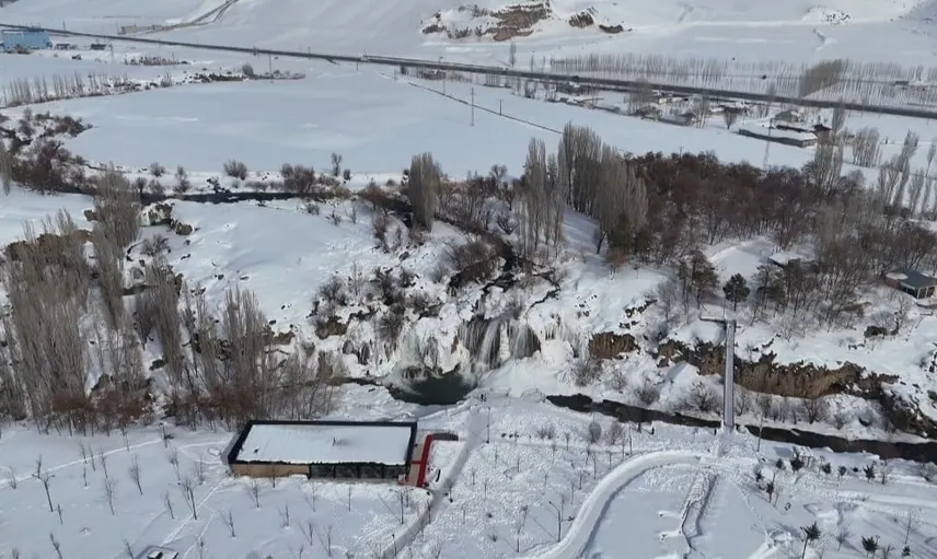 Van'ın ve bölgenin önemli doğal zenginliklerinden Muradiye Şelalesi, etkili soğuk hava koşulları sonucu büyük oranda donaraktan beyaz bir örtüyle kaplandı. Hava sıcaklıklarının sıfırın altına düşmesiyle şelalenin akışı buz kristallerine dönüşerek görüntüye kartpostallık bir dokunuş kazandırdı.