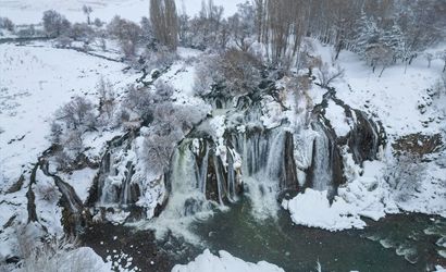 Van'da etkili olan kar yağışının ardından Muradiye Şelalesi'nin çevresi karla kaplandı.