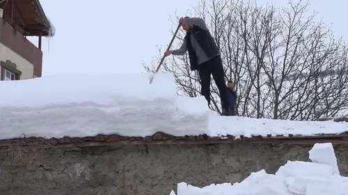 Muş’un Kale Mahallesi’nde yoğun kar yağışı tek katlı evlerin çatılarını kapladı; mahalle sakinleri, çökme endişesiyle sabahın erken saatlerinde küreklerle dam temizliği yaptı.