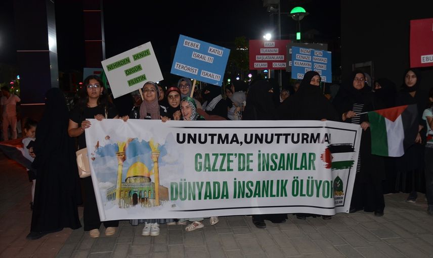 Kent Meydanı'nda bir araya gelen vakıf üyeleri ve vatandaşlar, İsrail aleyhinde sloganlar atarak tekbir getirdi.