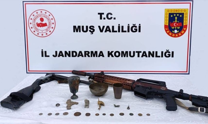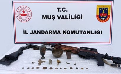 Muş'ta İl Jandarma Komutanlığı ekiplerince gerçekleştirilen operasyonda sikke ve objeler ele geçirildi. Aramada, 13 sikke, 4 heykel, 2 kadeh bardağı, kase, küpe, yüzük ile 2 ruhsatsız av tüfeği ele geçirildi.