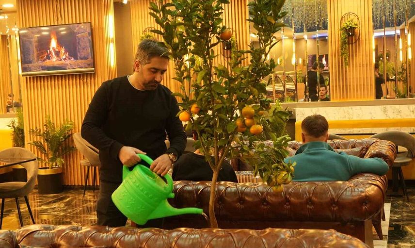 Muş’ta kafe işleten Nezir Yolcu, iş yerinde farklı bir konsept uygulayarak Siirt’ten getirttiği saksı mandalina fidelerini kafesinde yetiştirmeye başladı. Kısa sürede meyve veren fideler, hem mekânın doğal görünümüne katkı sağladı hem de olgunlaştıkça müşterilere ikram edilmeye başlandı.