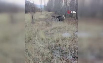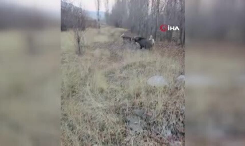 Muş'un Korkut ilçesine bağlı Karakale köyünde tarlaya inen bir yaban domuzu, arazide bulunan 2 çoban köpeğinin saldırısına uğradı. O anlar cep telefonu kamerasıyla kaydedildi.