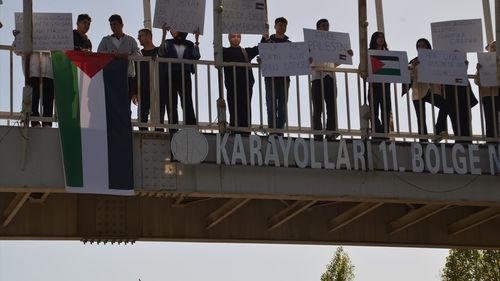 Erentürk Öz Şeker Anadolu Lisesi öğrencileri, okul konferansının ardından Bitlis-Muş kara yolundaki üst geçide yürüyüp Filistin bayrağı asarak Gazze'ye yönelik saldırıları protesto etti.