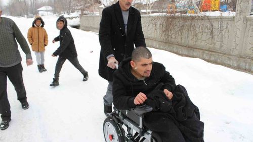 Muş'un Malazgirt muhtarı Hasan Başaran, Bulanık'taki 27 yaşındaki engelli Ahmet Aydın'ın annesinin mezarını ziyaret edebilmesi için talep ettiği akülü sandalyeyi temin etti.