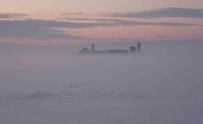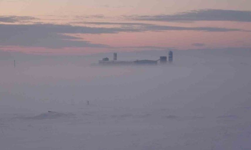 Ovada bulunan fabrika binaları ve kulübeler, sisin üzerinde adeta yüzer gibi görünürken, alt kesimlerin yoğun sisle örtülmesi ve üst bölgelerin gün batımının ışığıyla aydınlanması arasında belirgin bir kontrast oluştu. Bu katmanlı görünüm, sahneye derinlik ve fotoğrafik etki kattı.