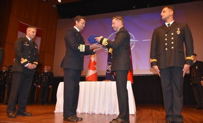Törene NATO Deniz Komutanlığı Kurmay Başkanı Tümamiral Jose Delgado, görevi devreden Kanadalı komutan Tuğamiral Matthew Coates ve görevi devralan Türk komutan Tuğamiral İlker Avcı’nın yanı sıra deniz üssü ve gemide görevli askerler katıldı.