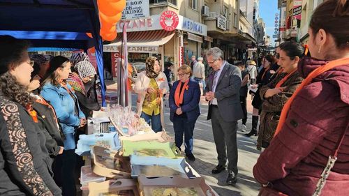 Nazilli'de ADEM ve SODAM kursiyerleri, 25 Kasım'da 'Kadına Şiddete Hayır' sergisiyle el emeği ürünlerini sergiledi; satışlar ev ekonomilerine katkı sağladı.