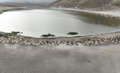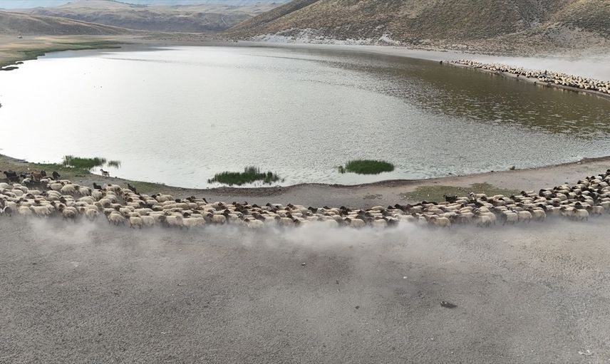 Bitlis'in Tatvan ilçesinde Nemrut Dağı eteklerindeki yaylalara çıkarılan küçükbaş hayvan sürüleri, su ihtiyaçlarının karşılanması için Kalp Gölü'ne götürülüyor.