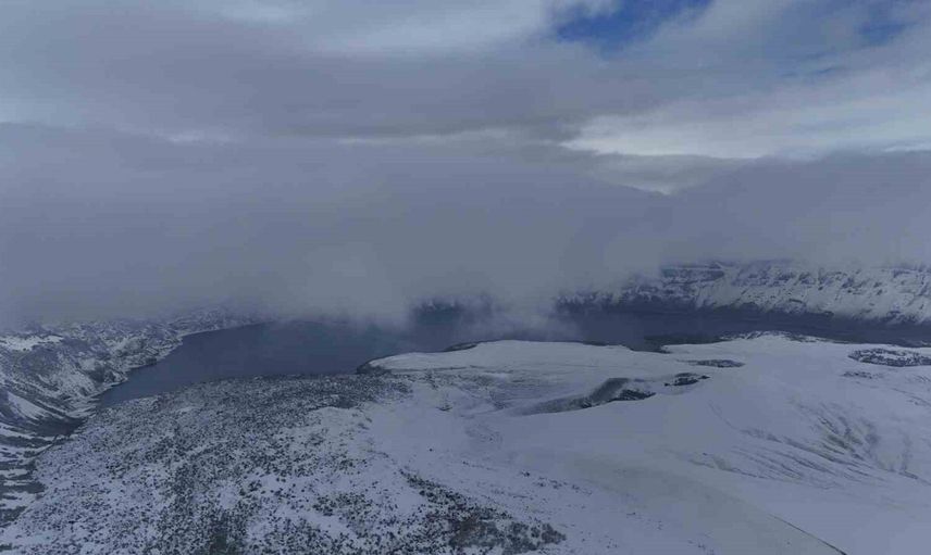 2 bin 250 rakımlı zirvesinde yer alan ve dünyanın ikinci büyük krater gölü olarak bilinen göl, karla birlikte çevresinde kontrast oluşturan mavi tonu korudu. Dronla görüntülenen kaldera, kar yağışı, sis bulutu ve gölün maviliğinin aynı karede buluştuğu kartpostallık sahneler sundu.