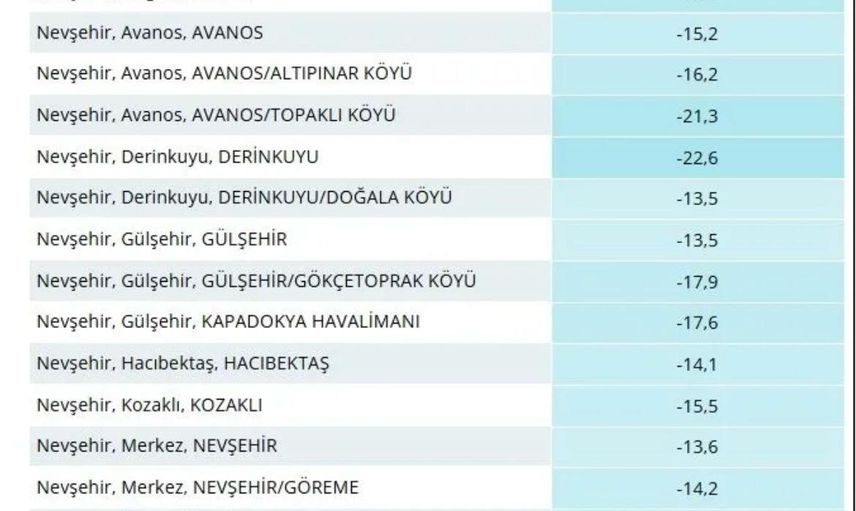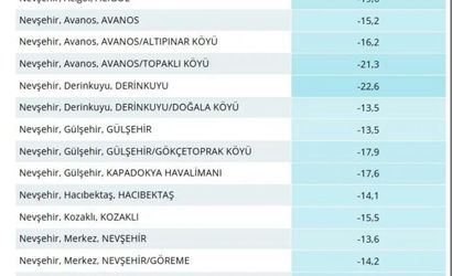 Gece saatlerinde yapılan ölçümlerde termometreler bazı yerlerde eksi 20 derecenin altına indi. İlçe bazlı en düşük sıcaklık Derinkuyu ilçesinde -22,6 derece olarak kayda geçti. Bunu Avanos'a bağlı Topaklı köyü -21,3 derece ve Acıgöl ilçesi -19,6 derece ile izledi.