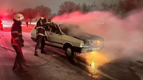 Nevşehir'de seyir halindeyken alev alan otomobil, itfaiye ekipleri tarafından söndürüldü.