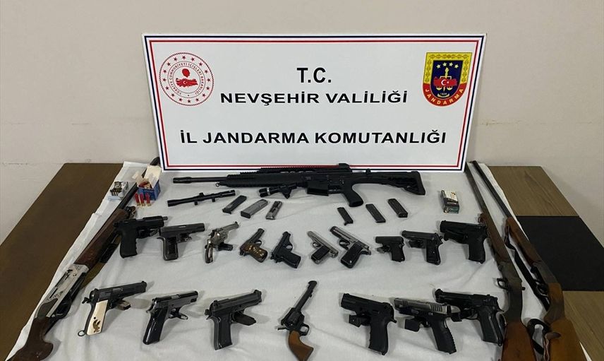 Nevşehir'de yasa dışı silah ticaretine yönelik operasyonda 21 silah ve 66 kesici alet ele geçirildi, 2 zanlı gözaltına alındı. Şüphelilerin adreslerindeki aramalarda, 13 ruhsatsız tabanca, 4 ruhsatsız av tüfeği, 4 ruhsatsız kurusıkı tabanca, 66 çeşitli ebatlarda kesici alet, 24 şarjör, 2 dürbün ve 96 fişek ele geçirildi.