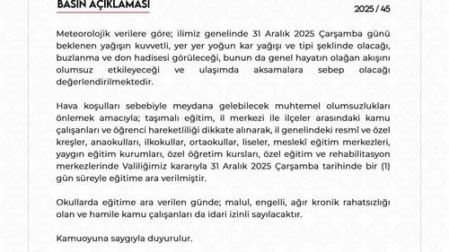 Niğde Valiliği, 31 Aralık 2025 Çarşamba günü kuvvetli kar ve tipi beklendiği için il genelinde eğitime 1 gün ara verildiğini açıkladı.