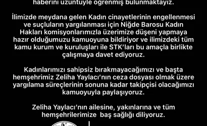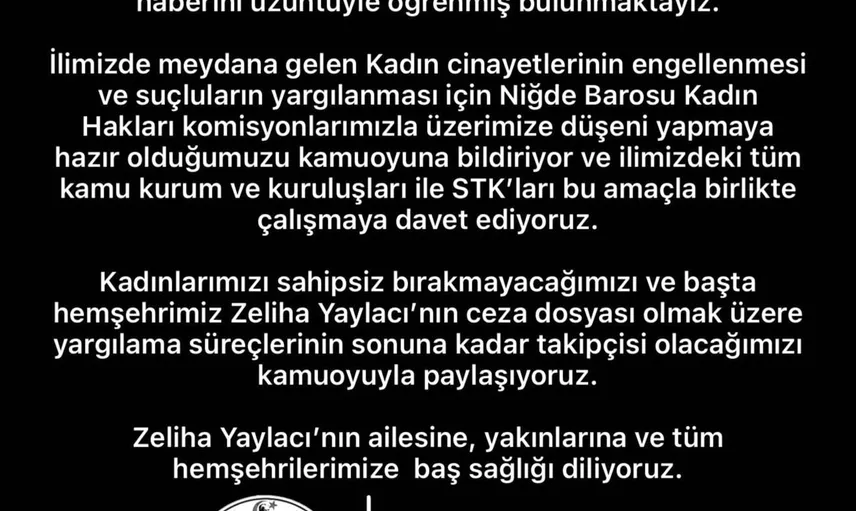 Niğde Barosu, olayın ardından yaptığı yazılı açıklamada kadına yönelik şiddetin toplumun kanayan yarası haline geldiğini vurgulayarak şunları paylaştı: "Bir kadın daha hayattan koparıldı. Niğde Barosu olarak Başak Zeliha Yaylacı’nın öldürülmesine ilişkin yargılama sürecini sonuna kadar takip edeceğiz. İlgili tüm kurum ve sivil toplum kuruluşlarını kadına yönelik şiddetle mücadelede birlikte hareket etmeye davet ediyoruz. Kadınlarımızı sahipsiz bırakmayacağımızı ve başta hemşehrimiz Zeliha Yaylacı’nın ceza dosyası olmak üzere yargılama süreçlerinin sonuna kadar takipçisi olacağımızı kamuoyuyla paylaşıyoruz. Zeliha Yaylacı’nın ailesine, yakınlarına ve tüm hemşehrilerimize baş sağlığı diliyoruz."