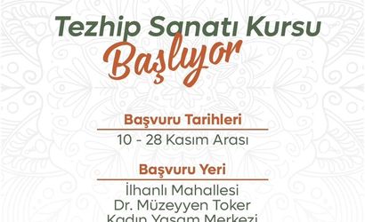 Tezhip Sanatı Kursu için başvurular 10-28 Kasım tarihleri arasında alınıyor. Başvurular, İlhanlı Mahallesi Dr. Müzeyyen Toker Kadın Yaşam Merkezi'nde şahsen yapılacak. Kursun düzenleyicileri başvurular ve kurs içeriği hakkında merkezden ayrıntılı bilgi alınabileceğini açıkladı.