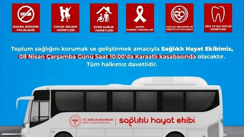 Niğde İl Sağlık Müdürlüğü mobil sağlık ekibi, 8 Nisan Çarşamba saat 10.00'da Karaatlı Kasabası'nda ücretsiz birinci basamak ve tarama hizmetleri sunacak.