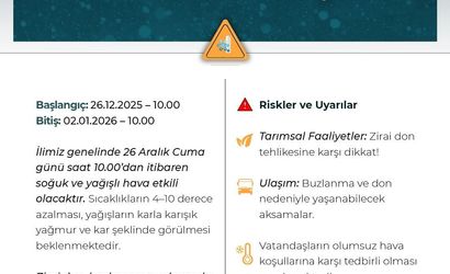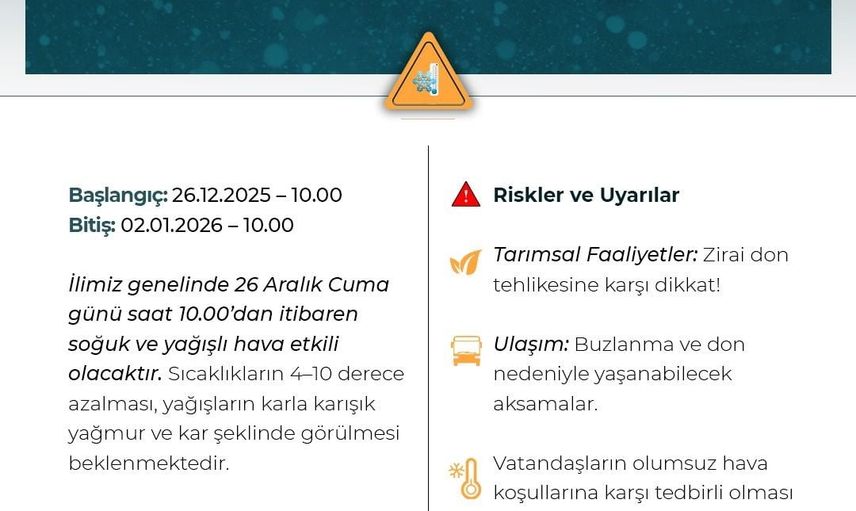 Valilik, özellikle tarımsal faaliyetlerle uğraşan üreticiler başta olmak üzere tüm vatandaşların zirai don riski, buzlanma ve don olayları ile ulaşımda yaşanabilecek aksamalar konusunda dikkatli ve tedbirli olmalarını istedi.