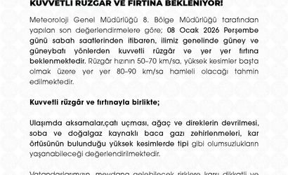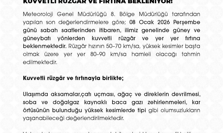 Valilik, kuvvetli rüzgar ve fırtınayla birlikte ulaşımda aksamalar, çatı uçmaları, ağaç ve direklerin devrilmesi, soba ve doğalgaz kaynaklı baca gazı zehirlenmeleri ile kar örtüsünün bulunduğu yüksek kesimlerde tipi gibi olumsuzlukların yaşanabileceğini vurguladı.