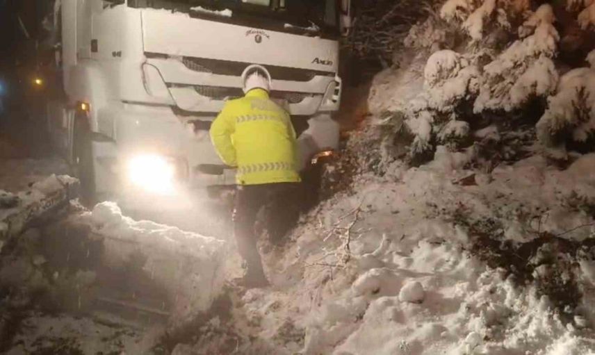 TOKAT’IN NİKSAR İLÇESİNDE ETKİLİ OLAN KAR YAĞIŞI NEDENİYLE KAPANAN YOLDA, POLİS EKİPLERİNİN ÖZVERİLİ ÇALIŞMASI KAMERAYA YANSIDI.
