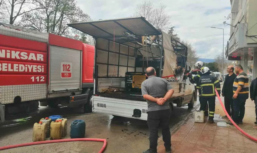 Tokat'ın Niksar ilçesinde Danişmend Gazi Bulvarı üzerinde park halindeki bir kamyonette yangın çıktı. İddiaya göre Z.A. idaresindeki, Niksar Ovası Sulama Birliği'ne ait kamyonetin arka kısmında bulunan jeneratörden sıçrayan kıvılcımlar yangına neden oldu.