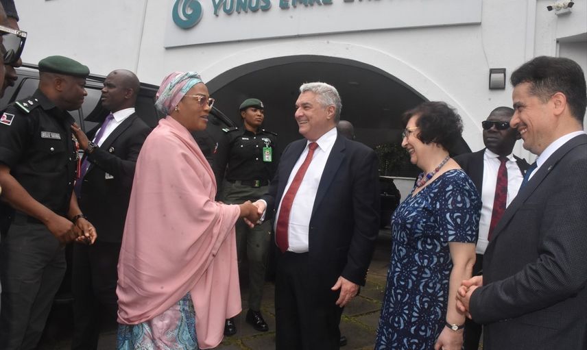 Nijerya Devlet Başkanı Bola Ahmed Tinubu'nun eşi Oluremi Tinubu, Nijerya'nın başkenti Abuja'daki Yunus Emre Enstitüsüne (YEE) ziyarette bulundu. Cumhurbaşkanı Recep Tayyip Erdoğan'ın eşi Emine Erdoğan'a verdiği söz nedeniyle YEE'yi ziyaret eden Tinubu (sol), Türkiye'nin Abuja Büyükelçisi Hidayet Bayraktar (sağ 3) tarafından karşılandı.