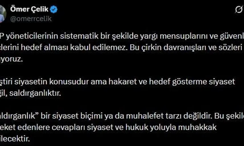 AK Parti Sözcüsü Ömer Çelik, sosyal medya hesabından yaptığı paylaşımda CHP yöneticilerinin sistematik bir şekilde yargı mensuplarını ve güvenlik güçlerini hedef almasının kabul edilemez olduğunu belirtti.