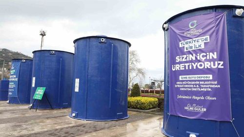 Ordu Büyükşehir Belediyesi, ORKOM'da ürettiği 30 ton kapasiteli fiberglas su depolarını OSKİ aracılığıyla kırsal mahallelere yerleştiriyor; hedef 93 mahalleye 104 depo.