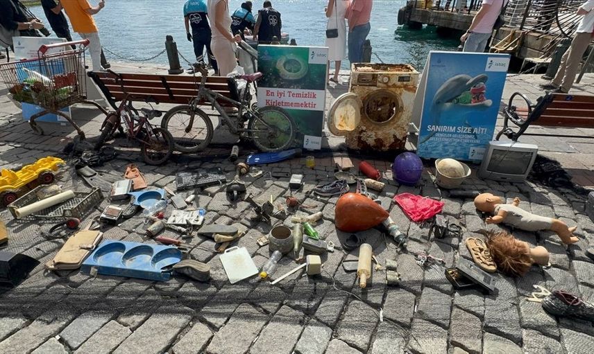 Çıkarılan malzemeler arasında cam şişe, lastik parçası, tenis raketi, metal para ve cep telefonu gibi çeşitli eşyalar yer aldı. Atıklar, Ortaköy İskelesi'nde sergilendi.