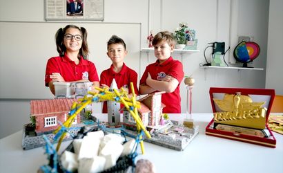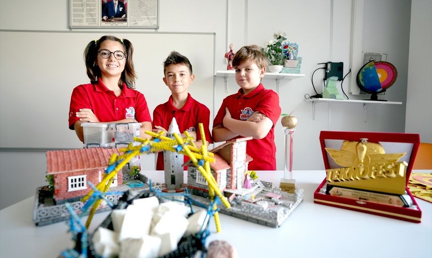 Ortaokul öğrencilerin Dora Doğan (solda), Fahri Demir Şentürk (ortada) ve Yusuf Ömer Demir (sağda) tarafından geliştirilen ve TEKNOFEST başta olmak üzere çeşitli yarışmalarda ödüle layık görülen "Depreme Karşı 5 Aşamalı Çözüm" projesi, basınca dayanıklı özel sistemiyle binaları güçlendirmeyi hedefliyor.