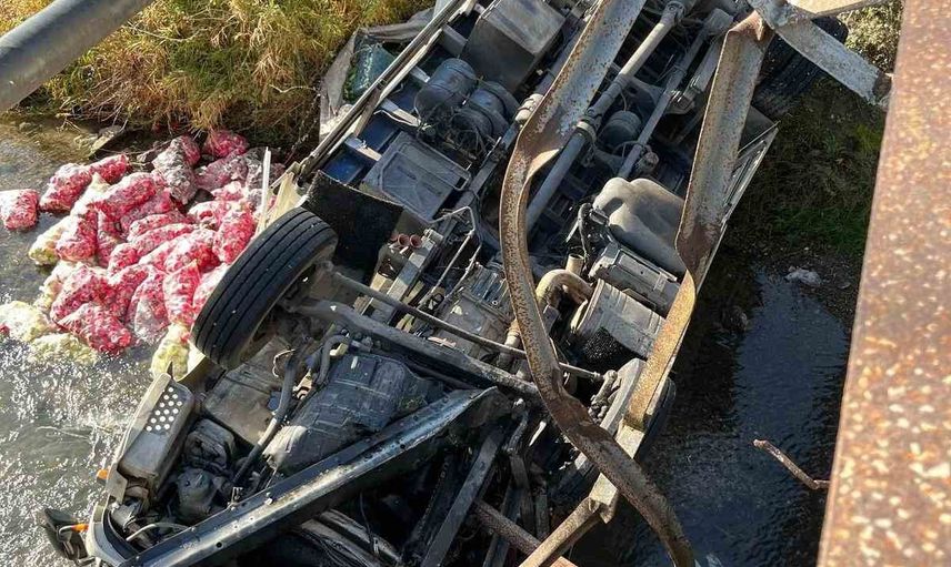 Osmaniye'nin Altıgöz köyü mevkii Kösreli yolu üzerinde, sürücüsünün direksiyon hakimiyetini kaybettiği belirtilen turp yüklü kamyon köprü üzerinde kontrolden çıkarak köprü korkuluklarını kırdı ve dere yatağına düştü.