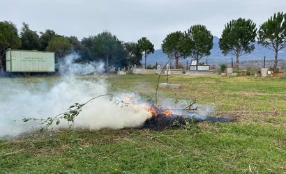 Farsak köyü Yavuz Sultan Selim Mahallesi Mezarlığı'nda gönüllüler ağaç budadı, duvar ve çeşme onarımı yaptı