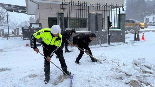 Osmaniye Hasanbeyli'de polisler, kar yağışı sonrası hizmet binaları önündeki karları kürekle temizleyerek vatandaşların güvenli giriş çıkışını sağladı.