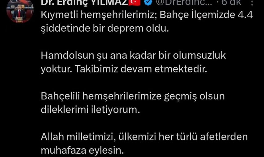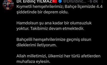 AFAD verilerine göre, saat 12.09'da, merkez üssü Bahçe ilçesi olan 4.4 büyüklüğünde bir deprem kaydedildi. Deprem 8.8 kilometre derinlikte gerçekleşti ve kent genelinde kısa süreli paniğe yol açtı.