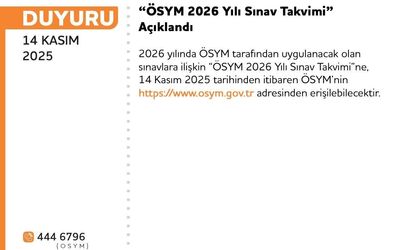 ÖSYM Başkanı Bayram Ali Ersoy paylaşımında şu ifadelere yer verdi: "Kıymetli adaylar, 2026 ÖSYM Sınav Takvimi belli oldu. Yükseköğretim Kurumları Sınavı (YKS) 20-21 Haziran’da, Dikey Geçiş Sınavı (DGS) 19 Temmuz’da, Milli Savunma Üniversitesi Askeri Öğrenci Aday Belirleme Sınavı (MSÜ) 1 Mart’ta gerçekleştirilecek. Kamu Personeli Seçme Sınavı (KPSS) Lisans Genel Yetenek-Genel Kültür uygulaması 6 Eylül’de, KPSS Alan Bilgisi uygulamaları 12-13 Eylül’de, KPSS Ortaöğretim ise 25 Ekim’de, Milli Eğitim Bakanlığı Akademi Giriş Sınavı (MEB-AGS) 12 Temmuz’da uygulanacak. 2026 Sınav Takvimine ÖSYM kurumsal web sayfası üzerinden ulaşabilirsiniz. Sınav uygulamalarına katılacak tüm adaylarımıza başarılar dilerim."