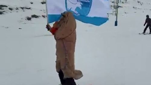 Palandöken Kayak Merkezi'nde Abdullah Hanlı, ehramlı 'Naciye Bibi' tiplemesi ve Erzurumspor bayrağıyla kayak yaparak kültürü ve sezonu tanıttı.
