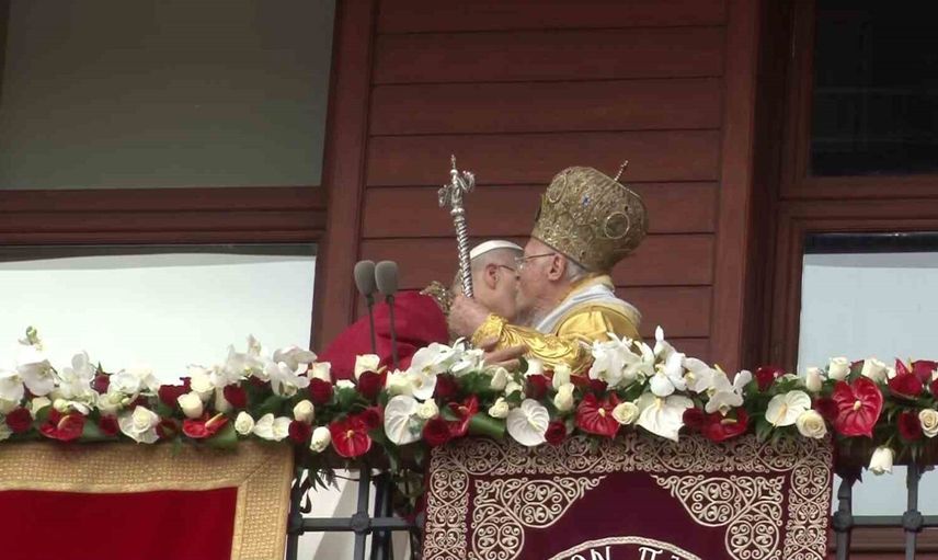 PAPA VE FENER RUM PATRİĞİ BARTHOLOMEOS BALKONA ÇIKARAK BİRLİKTE KATILIMCILARI SELAMLADI.