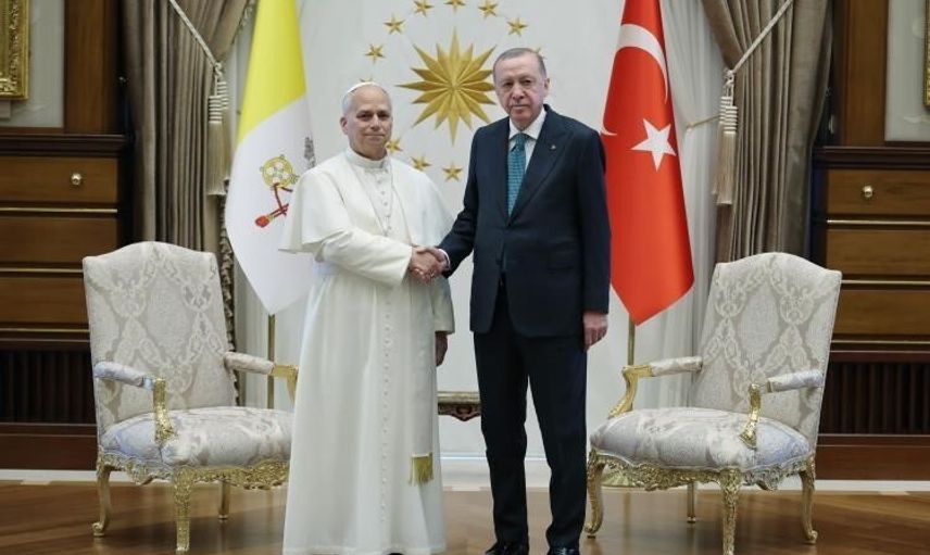 Görüşme Cumhurbaşkanlığı Millet Kütüphanesi Cihannüma Salonu’nda yapıldı; toplantıya Cumhurbaşkanı Recep Tayyip Erdoğan ile Papa 14. Leo katıldı. Erdoğan, Papa’nın ilk yurt dışı ziyaret durağı olarak Türkiye’yi tercih etmesinin önemine dikkat çekerek şunları söyledi: "Farklı kültürlerin bir arada barış içinde yaşadığı bir medeniyetin mirasçılarıyız. Küresel barış ve istikrar için üzerimize düşeni yapmaya devam edeceğiz. İnsanlık ailesi olarak Filistin halkına en büyük borcumuz adalettir, bu borcu ödemenin yolu ise 1967 sınırları temelinde iki devletli çözüm vizyonunu bir an önce hayata geçirmektir. Bunun için öncelikle Gazze’de varılan ateşkesin tahkim edilmesi, sivillerin güvenliğinin teminat altına alınması ve insani yardımların kesintisiz biçimde Gazze’ye ulaştırılması gerekiyor".
