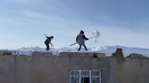 Ağrı'nın Patnos ilçesinde yoğun kar ve dondurucu soğuklara karşı köy halkı, imeceyle çatı temizliği, ahır yolları ve köy yollarını açarak dayanışma sergiledi.