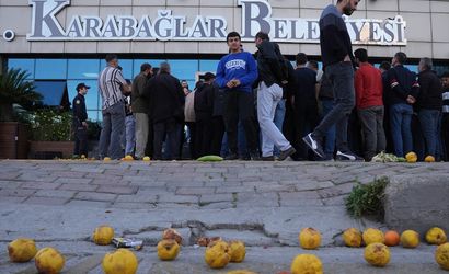 İzmir'in Karabağlar Belediyesi'nin pazar yerlerindeki tezgahlardan katı atık bedeli talep etmesine tepki gösteren pazarcı esnafı, belediye önünde eylem yaptı. Belediye Başkanı Helin İnay Kınay'ın kendileri ile görüşmeyi kabul etmediğini belirten esnaf meyve ve sebzeleri belediye binası önünde dökerek durumu protesto etti. Protesto sırasında zaman zaman zabıta ve esnaf arasında gerginlik de yaşandı.