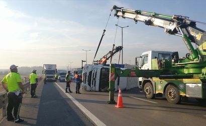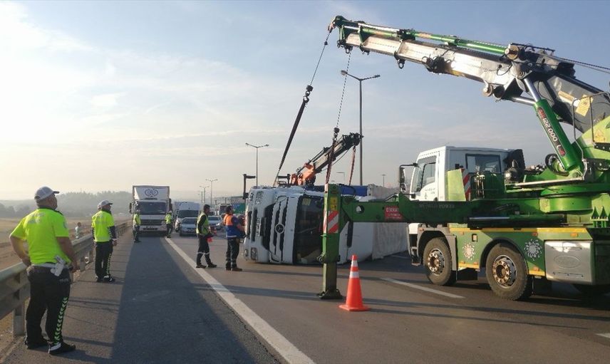 Kaza nedeniyle otoyolda trafik kontrollü bir şekilde sağlanırken, devrilen tırın bulunduğu yerden kaldırılması için çalışma başlatıldı.