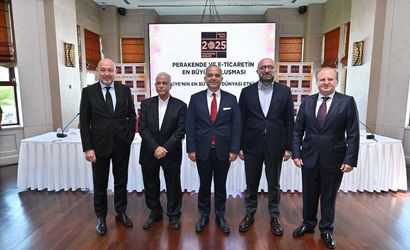 Perakende Günleri 2025, perakendeciler, AVM'ler, tedarikçilerle teknoloji, e-ticaret ve lojistik firmalarını Haliç Kongre Merkezi'nde bir araya getirdi. Perakende Günleri 2025'in açılışı dolayısıyla düzenlenen basın toplantısına Gıda Perakendecileri Derneği (GPD) Yönetim Kurulu Başkanı Alp Önder Özpamukçu (sağda), Birleşmiş Markalar Derneği (BMD) Başkanı Sinan Öncel (solda), Alışveriş Merkezleri ve Yatırımcıları Derneği (AYD) Yönetim Kurulu Başkanı Nuri Şapkacı (ortada), Zincir Mağazalar Derneği (ZMD) Yönetim Kurulu Başkanı Serhan Tınastepe (sağ 2) ve Taklitle Mücadele Derneği (TMD) Başkanı Selçuk Güzenge (sol 2) katıldı.